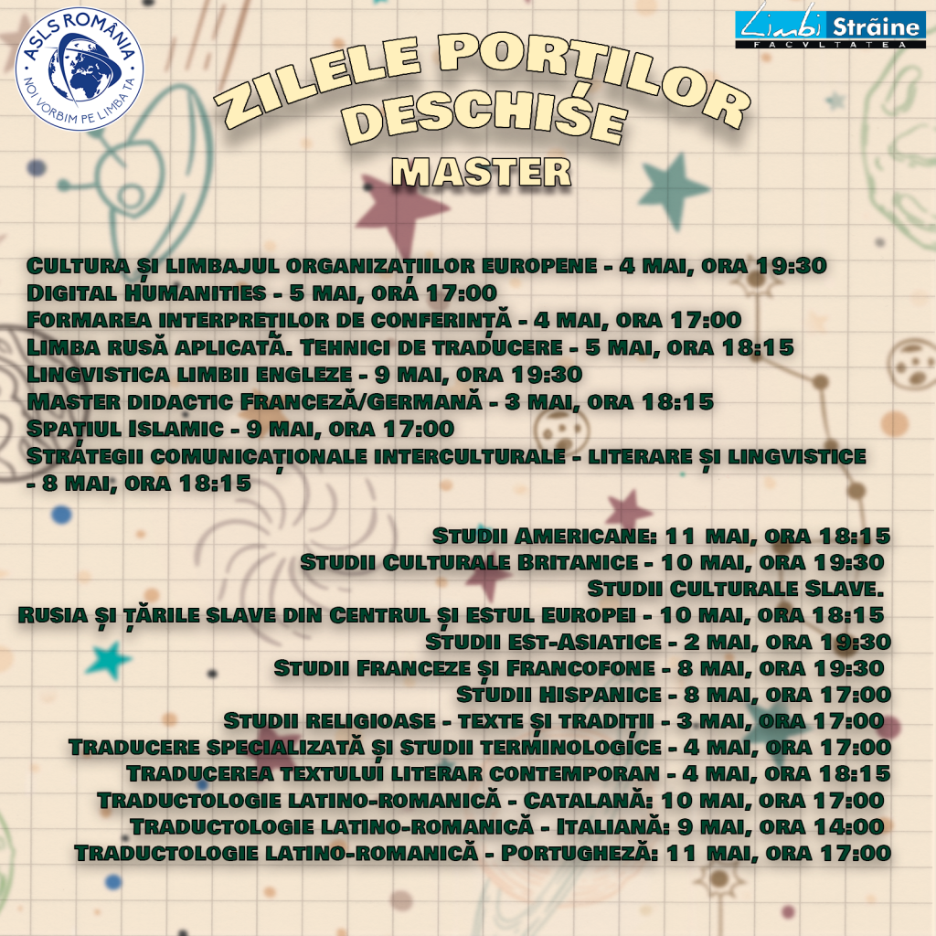 Facultatea de Limbi și Literaturi Străine, împreună cu Asociația Studenților din Facultatea de Limbi și Literaturi Străine (ASLS), pregătește în perioada 2-12 mai, pentru toate persoanele interesate de limbi străine, webinare pentru fiecare program de studiu.