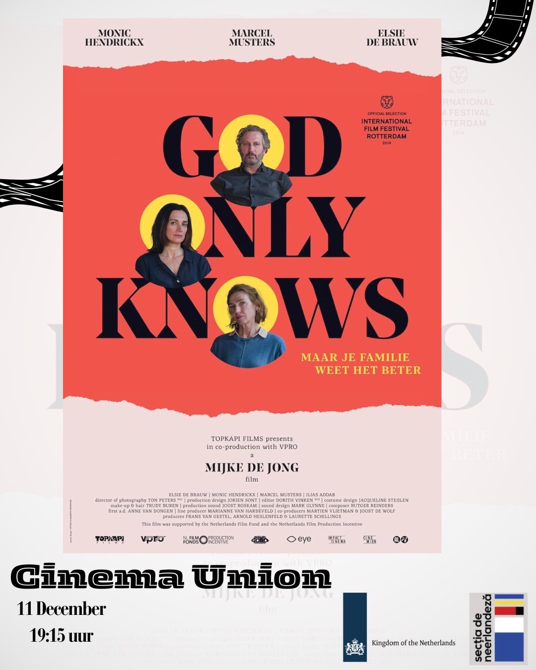 Vă invităm joi, 11 decembrie 2025, la o proiecție specială a filmului neerlandez God Only Knows (2019), în prezența regizoarei Mijke de Jong. Filmul spune povestea a trei frați de vârstă mijlocie, cu personalități diferite, care încearcă să treacă împreună peste sărbătorile de Paște, în timp ce unul dintre ei are un episod psihotic.