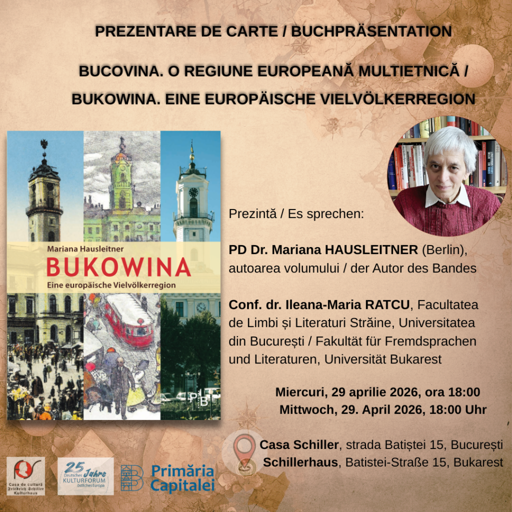 Casa de Cultură „Friedrich Schiller”, în colaborare cu Forumul Cultural German pentru Europa de Est, organizează miercuri, 29 aprilie 2026, ora 18:00, la sediul Casei Schiller din București, prezentarea volumului Bukowina Eine europäische Vielvölkerregion / Bucovina: o regiune europeană multietnică, semnat de PD Dr. Mariana Hausleitner, și apărut în seria „Biblioteca Potsdam a Europei de Est – Istorie” a Forumului Cultural German pentru Europa de Est.