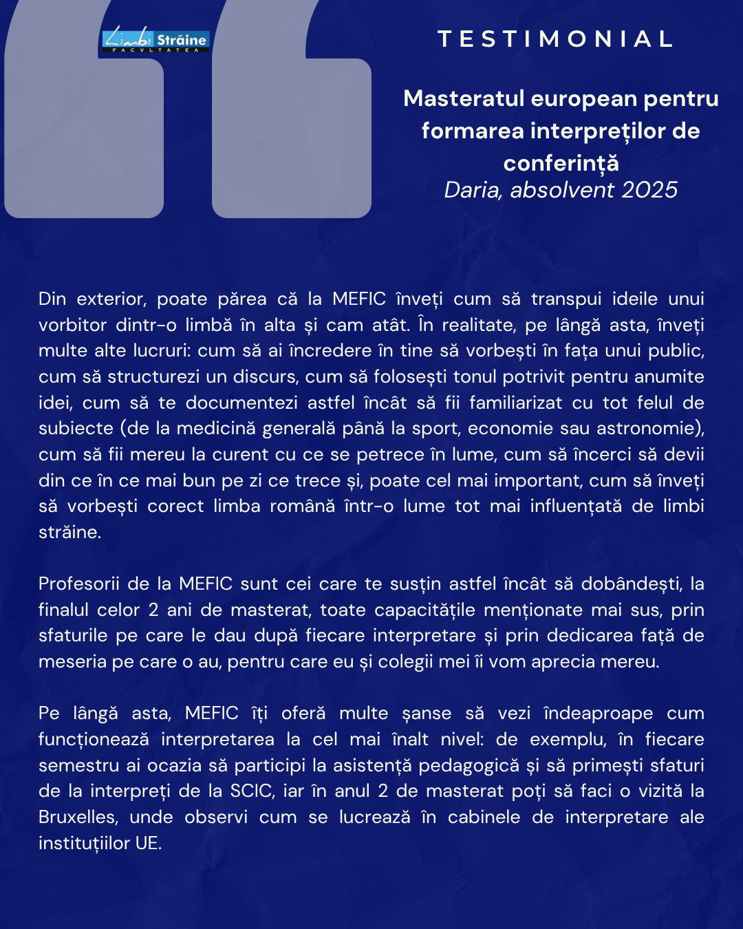 Masteratul european pentru formarea interpreților de conferință (4 semestre, 120 ECTS) pregătește interpreți capabili să lucreze în instituții din țară și din Uniunea Europeană (ca urmare a unui test de acreditare organizat în comun de Comisia Europeană, Parlamentul European și Curtea de Justiție a Uniunii Europene) sau pentru servicii în interes comunitar (instanțe judecătorești, primărie, poliție, spitale etc.), pe baza unui contract permanent sau temporar, în funcție de necesitățile instituționale.